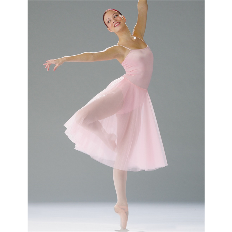 This dainty dress is a knee length double layer chiffon circle skirt attached to a lycra square neck leotard with lycra binding and straps. Top is shelf lined.
