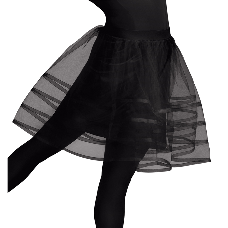 This contemporary knee length tutu features a 1" covered elastic waistband and eye-catching rows of horizontal ribbon stripes. Great for practice or performances. Content: Main: 100% Polyester, Contrast: 95% Polyester/5% Spandex
