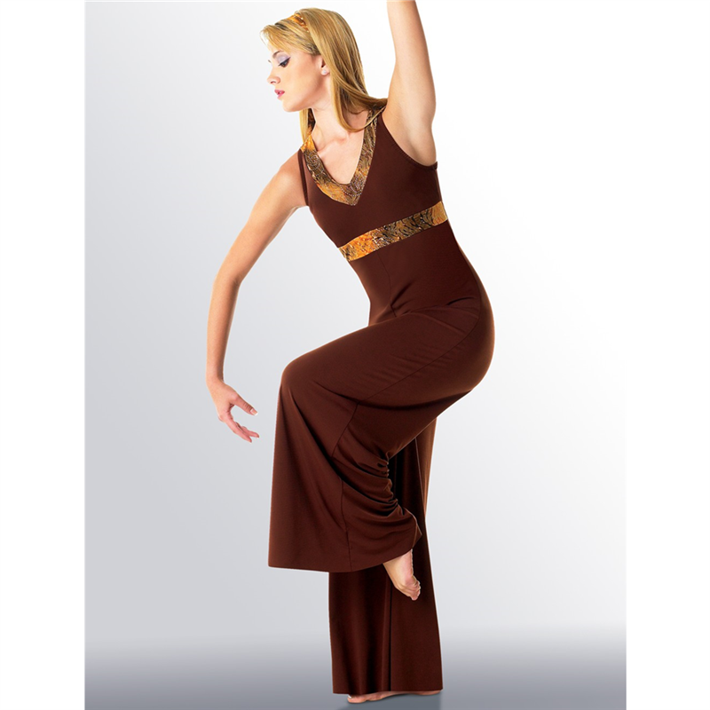 Poly spandex jumpsuit is full length. Trimmed with glitter gauze accents. Limited stock, allow up to 6 to 8 weeks. In needed sooner, please call 212-725-1174.
